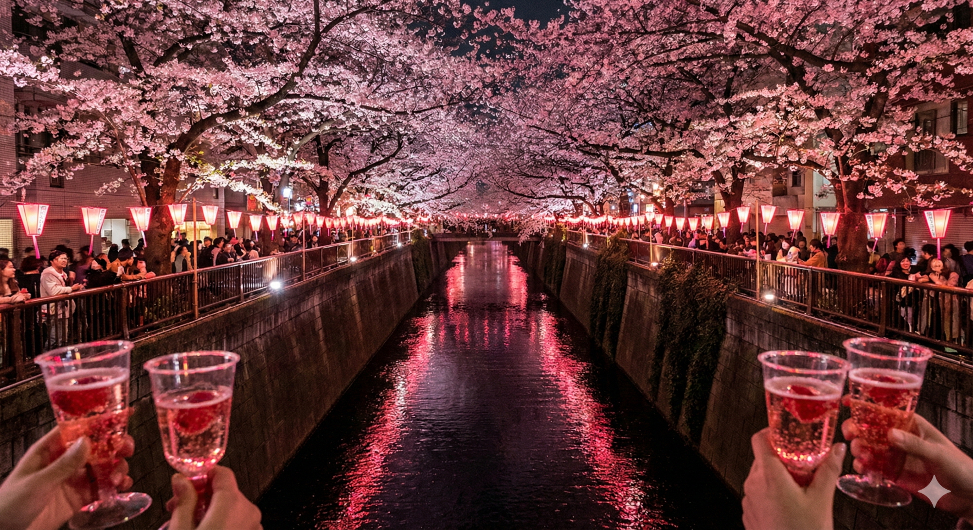 메구로강을 따라 4km에 걸쳐 피어난 벚꽃은 도시적인 세련미를 자랑합니다. 강 양쪽으로 늘어선 벚나무들이 서로 맞닿아 터널을 이루고, 그 아래로 흐르는 강물에 꽃잎이 떨어져 '하나이카다(꽃 뗏목)'를 이룹니다. 나카메구로의 상징은 '핑크 샴페인'과 '딸기 스파클링'입니다. 강변의 힙한 카페와 상점들이 시즌 한정 메뉴를 내놓으며, 한 손에 샴페인을 들고 산책하는 것이 이곳의 문화입니다.